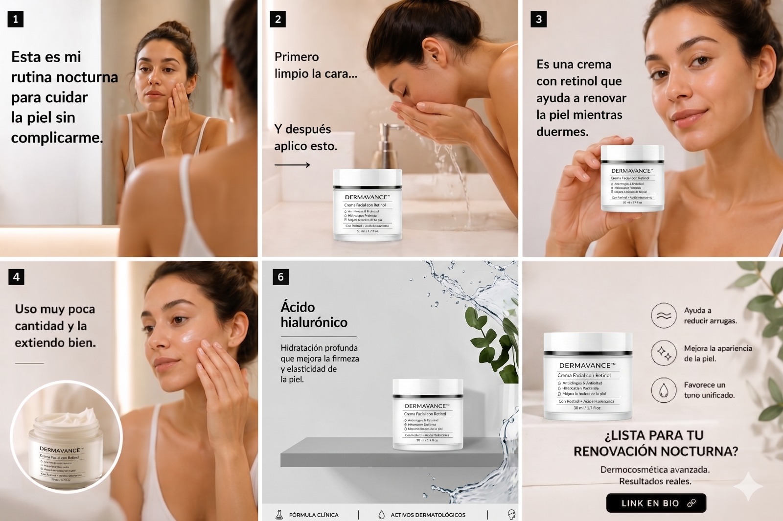 Usar solo por la noche. Aplicar una pequeña cantidad sobre el rostro limpio y seco.